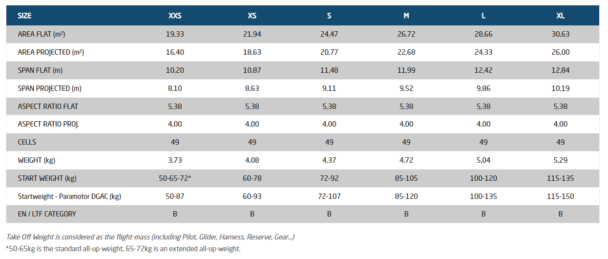 Duralight konstrukce: padák kombinuje lehké a odolné materiály v kombinaci s konstrukcí, která šetří hmotnost. Výsledkem je odolný a lehký kluzák v nejfrekventovanější kategorii EN-B.